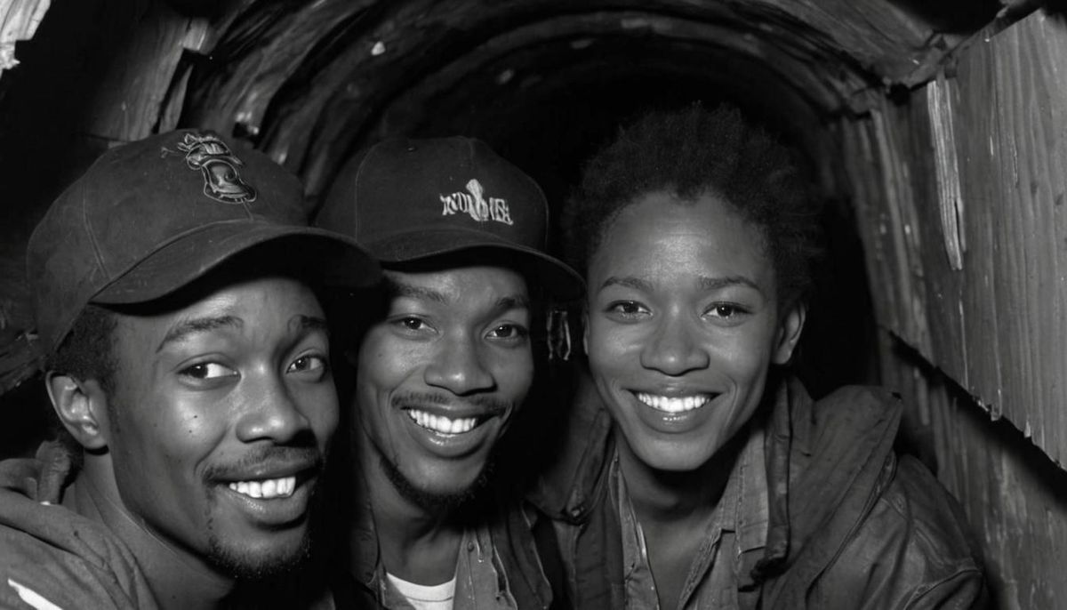 Photorealistic high resolution, high contrast. Dynamic angle. Black & white, 1995, Dorothea Lange. (Very Dark, pitch black:1.2). (Shanty Town with plywood and cardboard huts:1.3) in the (wide open (gritty rubbelled:1.3) underground NYC Freedom Tunnel area:1.3) (Medium close-up:1.2) of (Black man chuckling ...