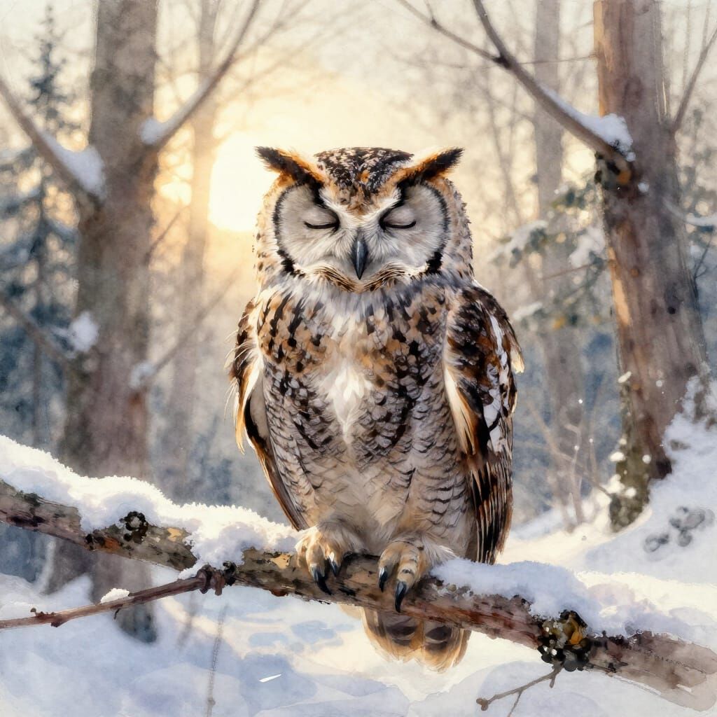 This image shows a wise, old owl resting on a snow-covered branch at dawn, painted in a soft watercolor style with visible brushstrokes and bleeding colors.