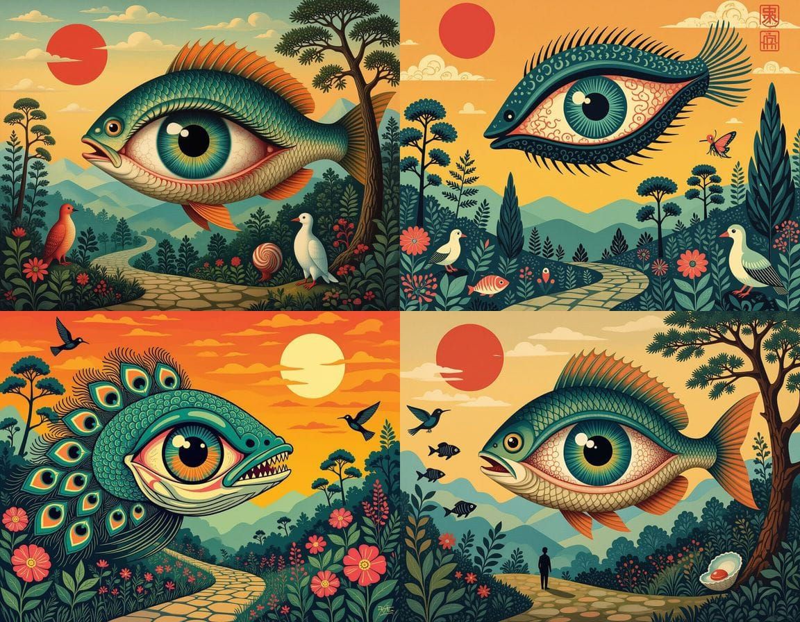 This surreal image features a bizarre, mutated creature with peacock, shark, and whale elements, set against a vibrant red-orange sunset. Influenced by Belgian surrealism.