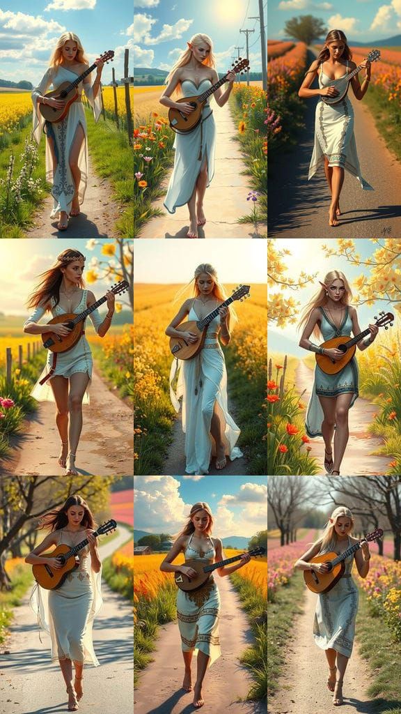 This image shows a beautiful young half-elf bard walking through a field on a spring day. She is playing a lute and wearing a short white dress with gold and blue detailing in a hyperrealistic style.