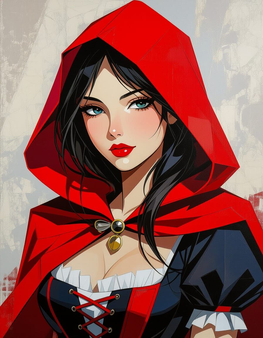 This image depicts Red Riding Hood with fine details, rendered in an abstract art style using complementary colors. The artwork combines elements inspired by classical and modern artistic approaches.