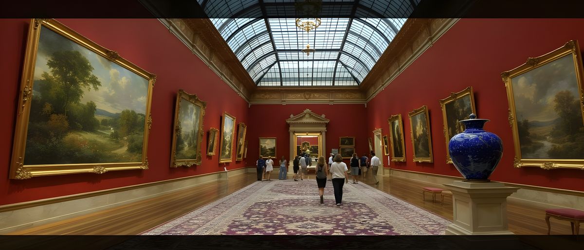 A view inside a grand art museum gallery with dark red walls. The gallery features landscape paintings, Persian rugs, a lapis lazuli urn, and a Tiffany skylight.