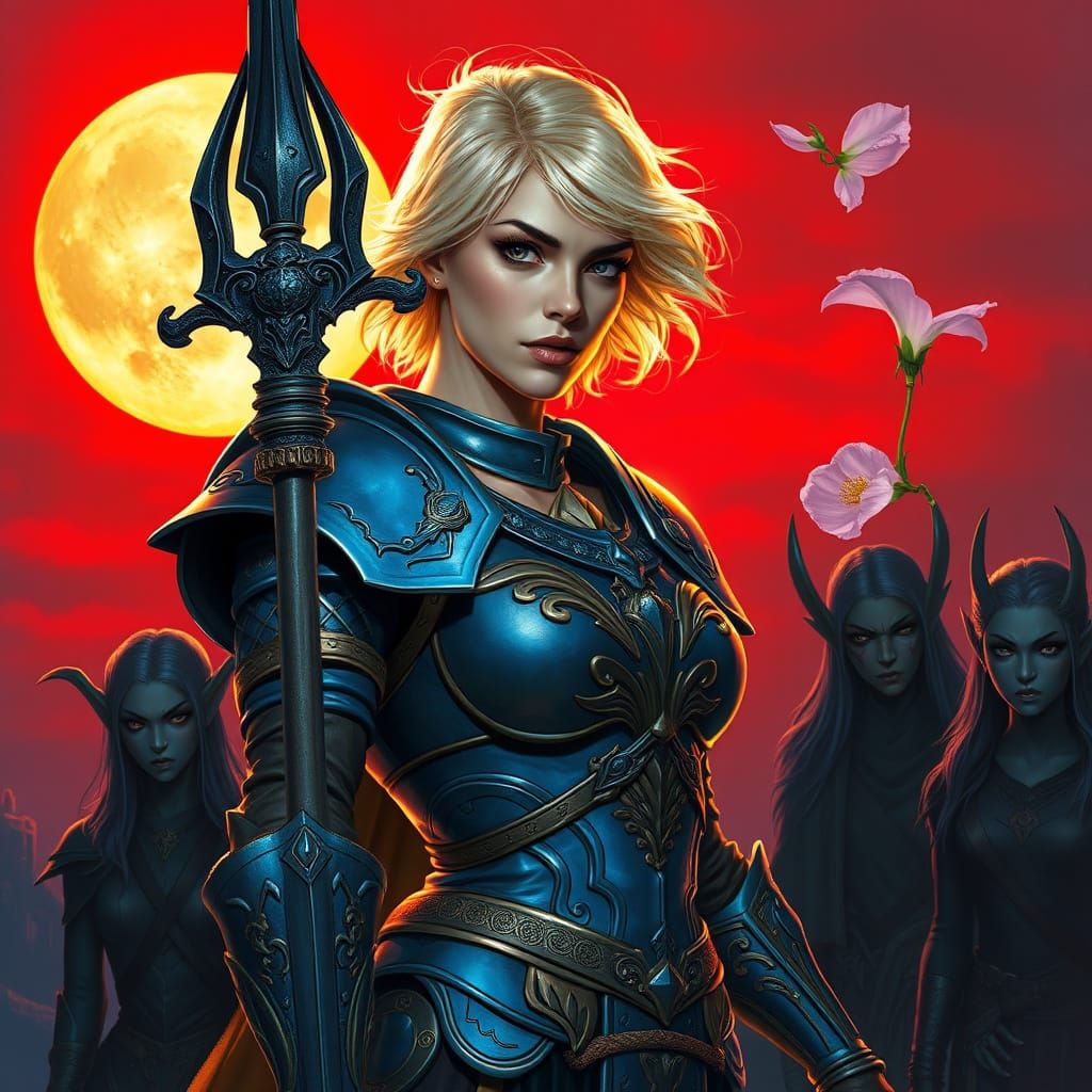 This image shows a stunning blonde warrior heroically standing against a fiery red horizon, illuminated by the full moon. Her resplendent blue and gold armor shines with an ethereal light, and she holds a majestic spear with a dark, ancient power. The atmosphere is heavy with tension and sorrow, as if th...