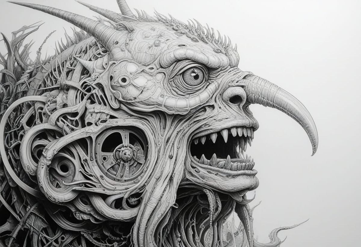 A detailed pencil drawing of a whimsical monster in a bizarre museum setting. The image is rendered with intricate detail and hyperrealism, evoking a blend of fantasy and surrealism.