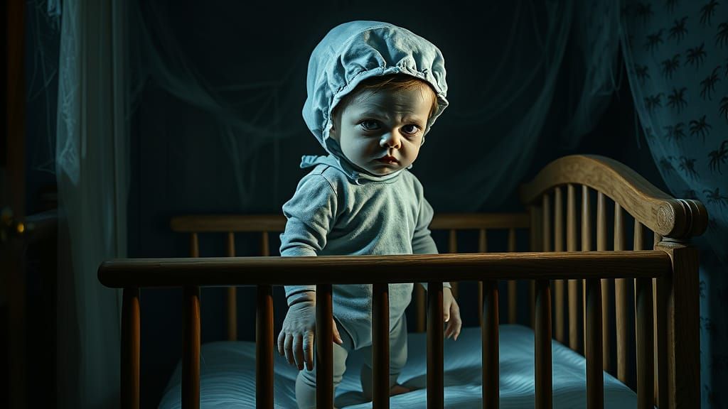 A haunting image of a two-year-old Frankenstein's monster standing in a crib, surrounded by dark shadows and cobwebs, evoking a sense of eerie childhood innocence