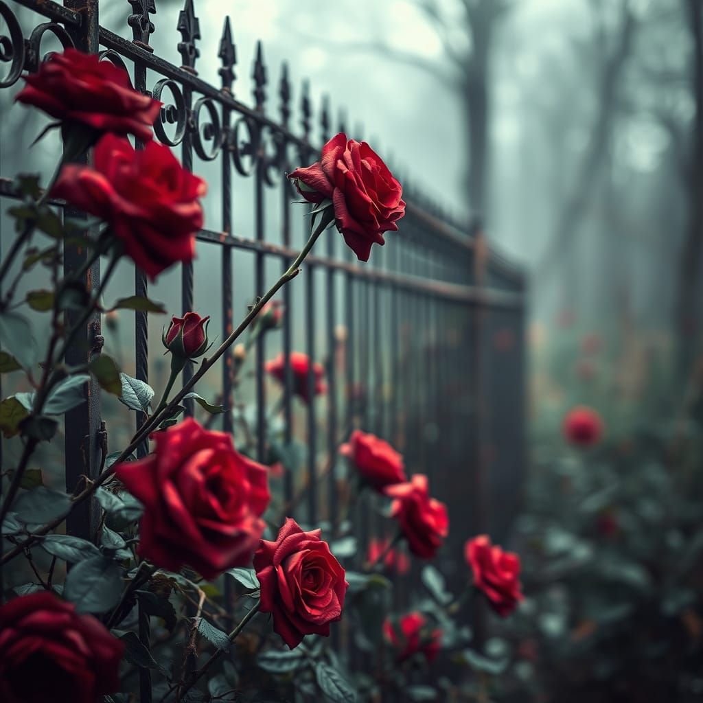 This image shows a haunting abandoned garden with dead, blood-red roses climbing a wrought iron fence. The creepy, gothic scene evokes a vintage aesthetic with dramatic lighting and blurred background.