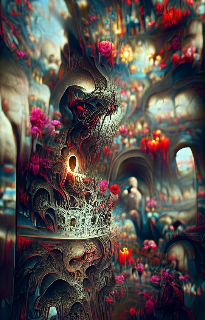 lucifer the prince of darkness, by Roberto Aizenberg, Zdzisław Beksiński, Thomas Kinkade, Peter Gric and Dan Mumford; flowers