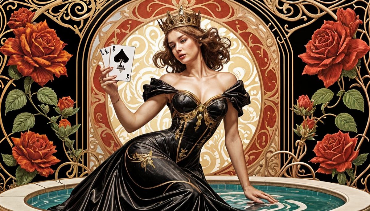 This digital art features four royal queens emerging from giant playing cards. The scene is rich with crimson patterns, amber liquid, and deep red roses, rendered in a style reminiscent of Art Nouveau illustration.