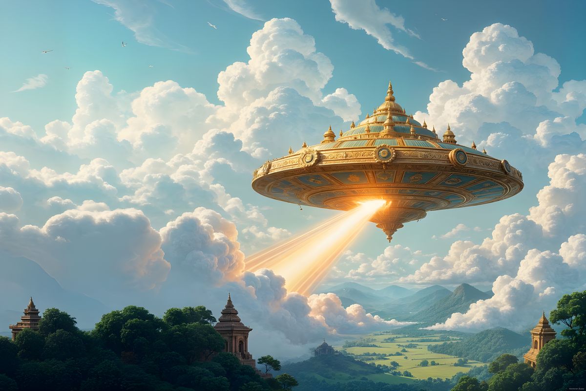 A striking picture of an ancient Indian vimana flying above a green landscape. The spacecraft has detailed carvings, an ethereal glow, and is surrounded by swirling, vibrant colors, in a science fiction aesthetic.