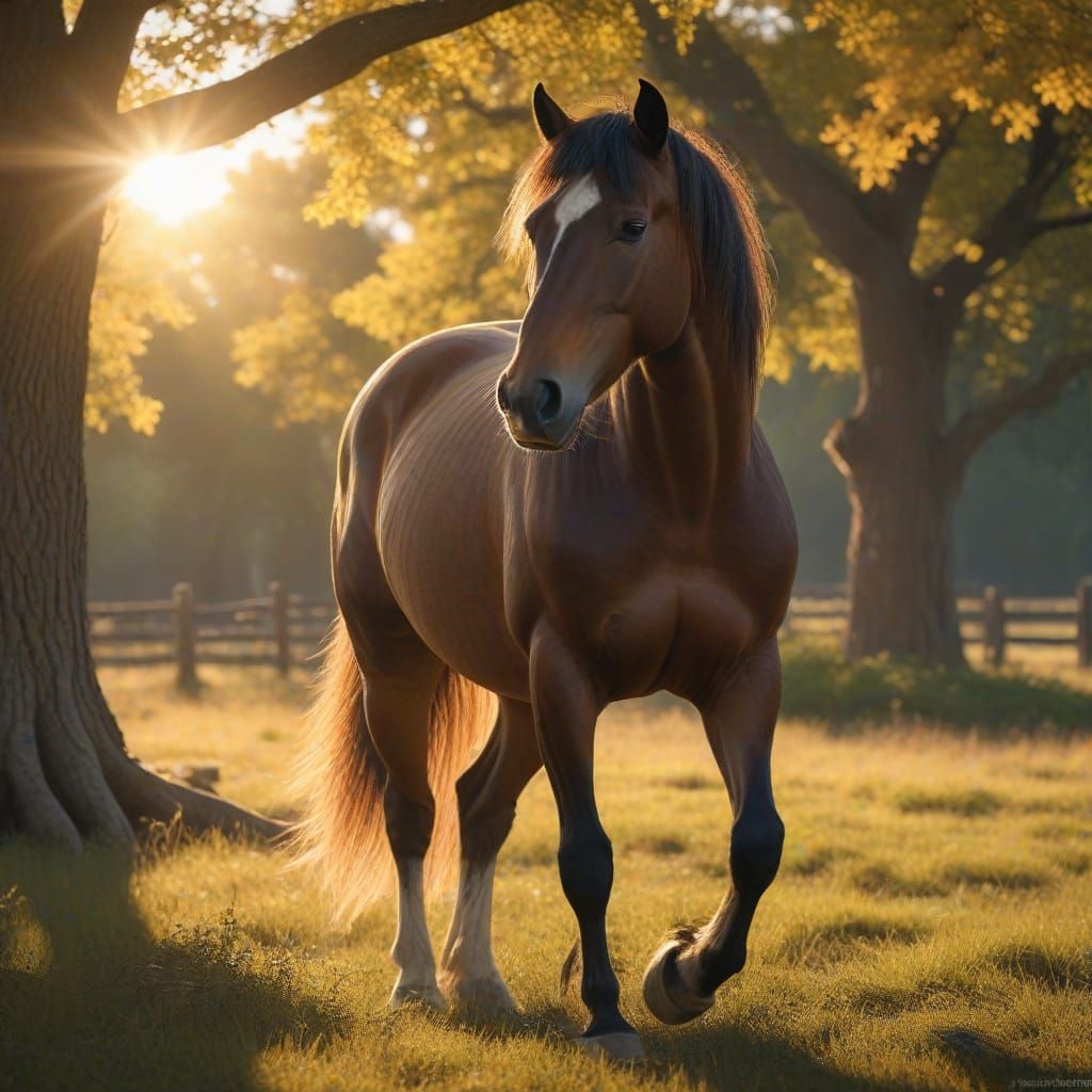 This image shows a majestic thoroughbred stallion in a sun-dappled meadow. Golden hour lighting highlights its powerful physique and the textures of surrounding ancient trees. Rendered in a painterly style.