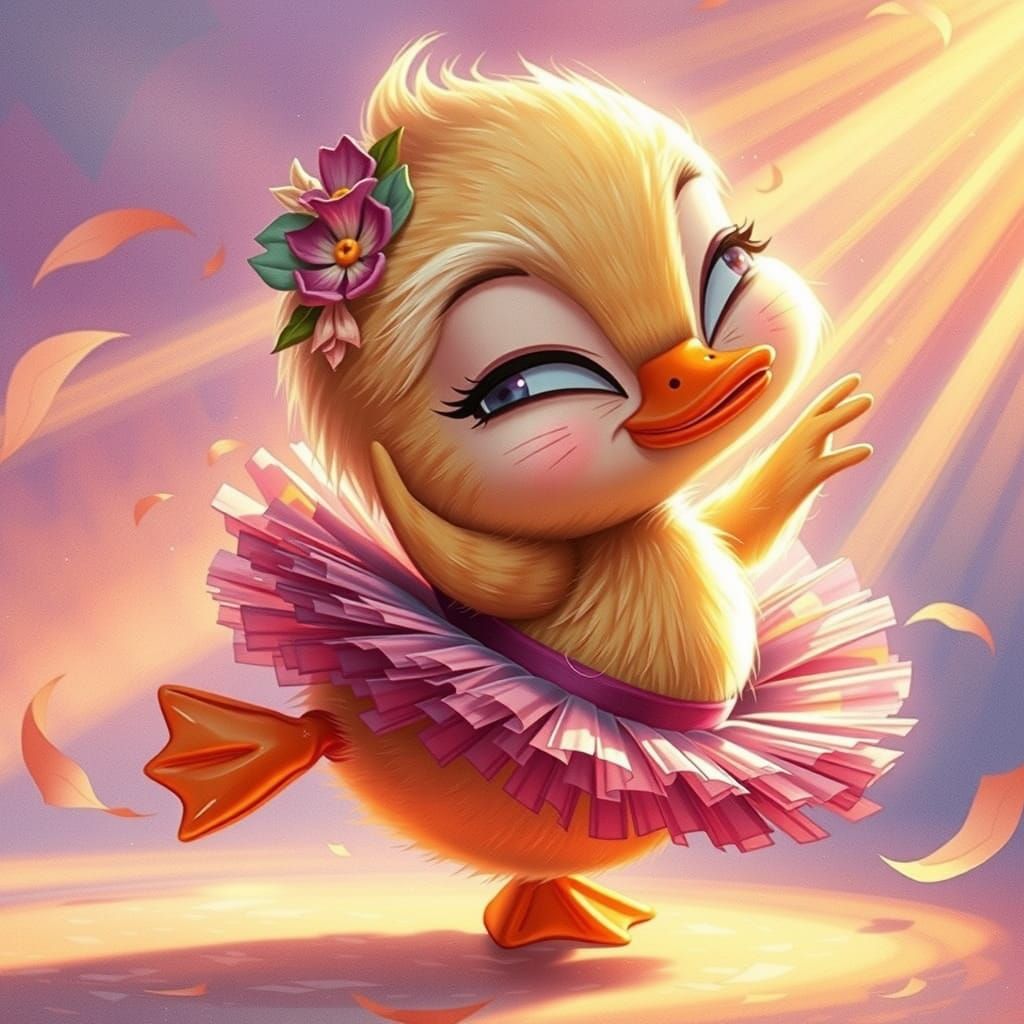 This image shows a darling cartoon duckling joyfully dancing in a pink tutu. Surrounded by vibrant watercolor flowers, it is rendered with expressive brushstrokes and 3D Unreal Engine shading.