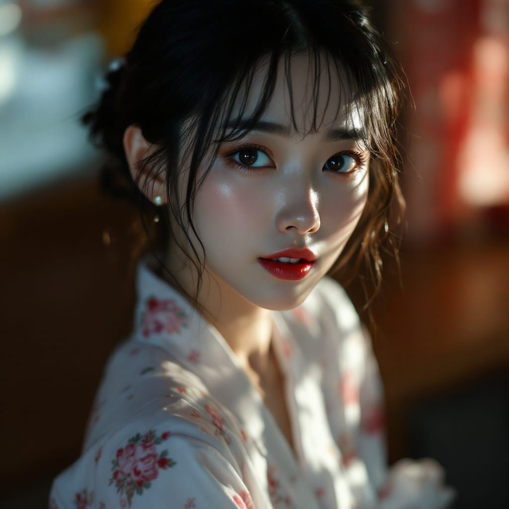 This image shows a beautiful Japanese woman in a nurse's outfit, captured with cinematic lighting and shallow depth of field for a photorealistic look. Inspired by classic portraiture.