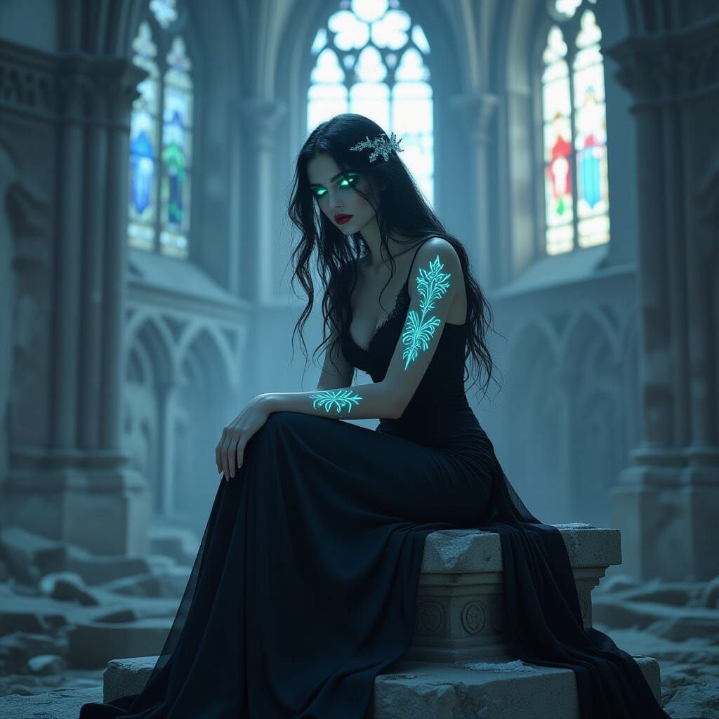 A gothic fairy with glowing tattoos sits on a ruined statue. Her eyes shine in soft light, creating a melancholic and defiant scene in a dark surreal style.