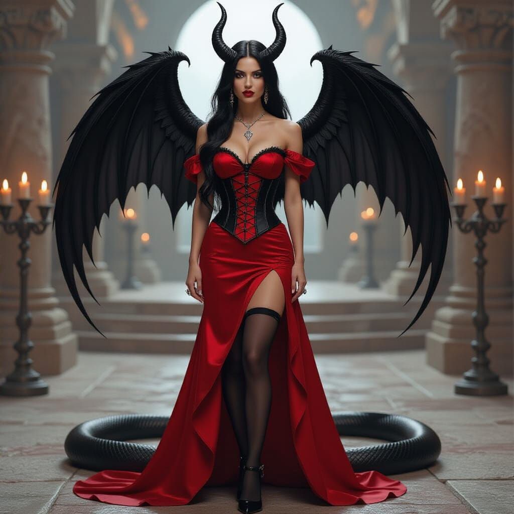 This image shows a striking goddess with dark wings and dramatic makeup, posed in an ancient temple. A snake coils around her waist as she stands in an off-the-shoulder dress, rendered with cinematic film aesthetics.
