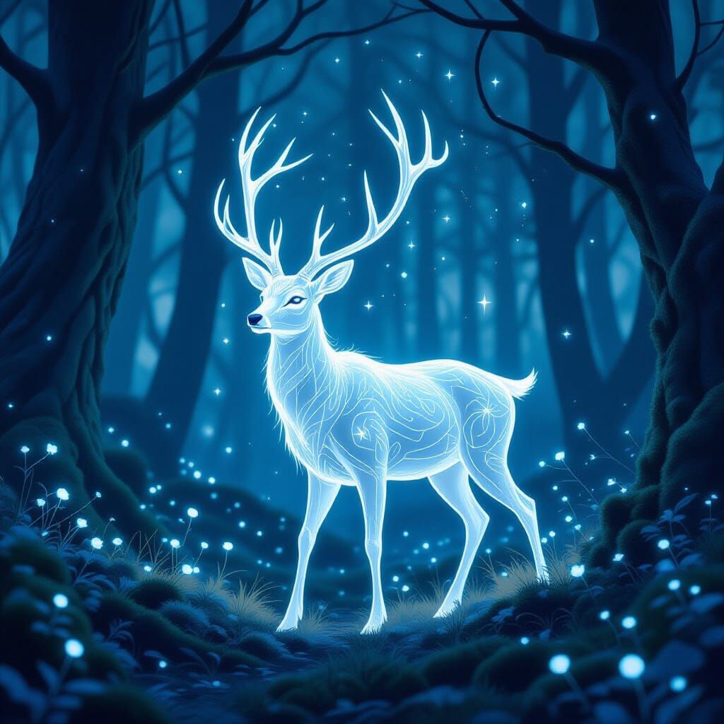 A depiction of a spectral deer in a glowing forest. The deer's form is translucent and adorned with glowing glyphs, in a style that evokes mystical and atmospheric digital artwork.