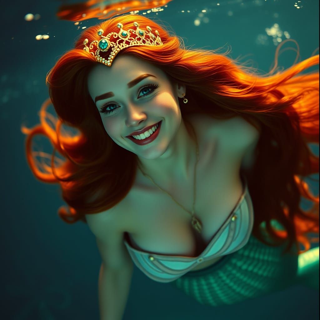 A cinematic image of a smiling mermaid queen swimming underwater. She has long reddish-brown hair, a shell top, and a shimmering green tail, with warm, golden lighting and emerald and turquoise color grading, as a live-action film still.
