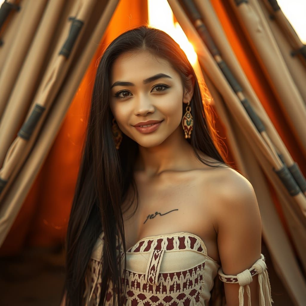 This image shows a serene Native American woman stepping out of a traditional Teepee, playfully posing in the warm golden light of sunset. Rendered in a photorealistic style, she exudes natural beauty and tranquility, with intricate details and textures capturing the essence of her traditional dress and ...