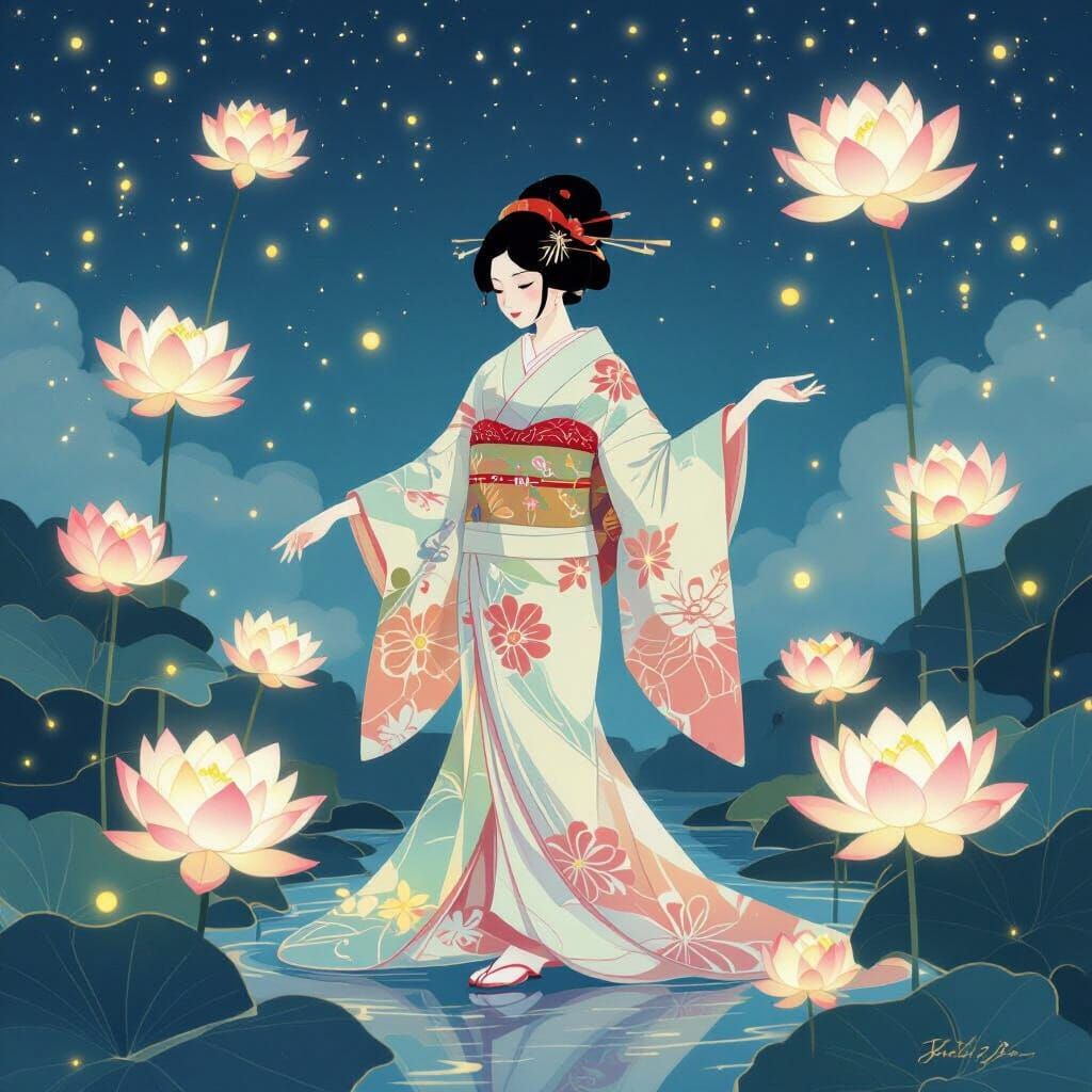 This image shows a geisha dancing among glowing origami lotuses under a starry sky. The artwork is reminiscent of traditional Japanese art, with soft, ethereal lighting and pastel colors.