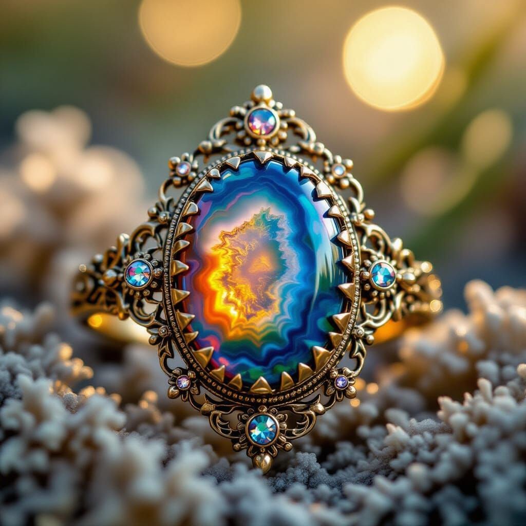 This image shows a vibrant, beautifully cut agate gemstone. It features ornate metalwork and delicate textures, captured with professional photography techniques and a sharp focus.