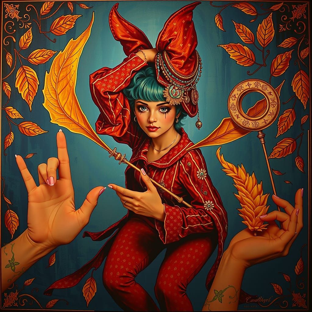 A photorealistic image depicting a chimaera figure with teal hair, a yellow flower, and elements of matador and harlequin. The artwork features a bright, ethereal sheen and detailed textures.