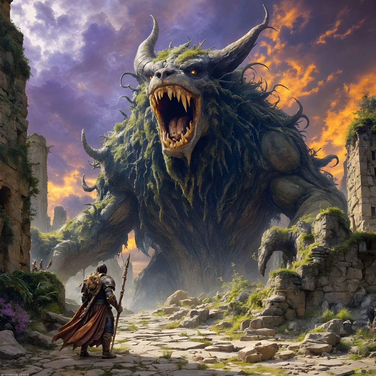 This image shows a lone warrior in ornate armor facing a colossal, moss-covered petrified beast integrated into a forgotten city. The sky is a dramatic mix of purple and orange, rendered in an epic fantasy illustration style with textured, painterly brushwork.