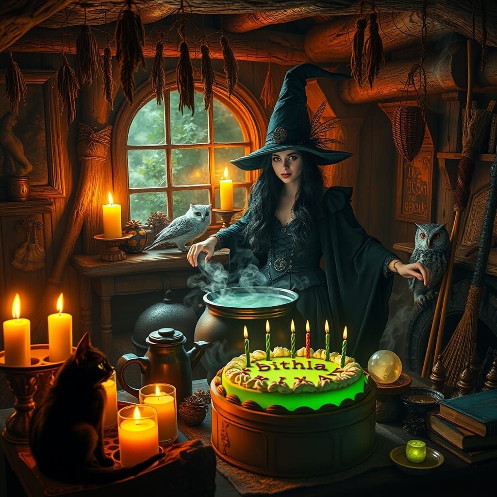 A witch celebrates her birthday in a gothic, candlelit cottage with spellbooks, potions, and animal guests. Features a bubbling cauldron, enchanted cake, and mystical smoke in warm amber light.