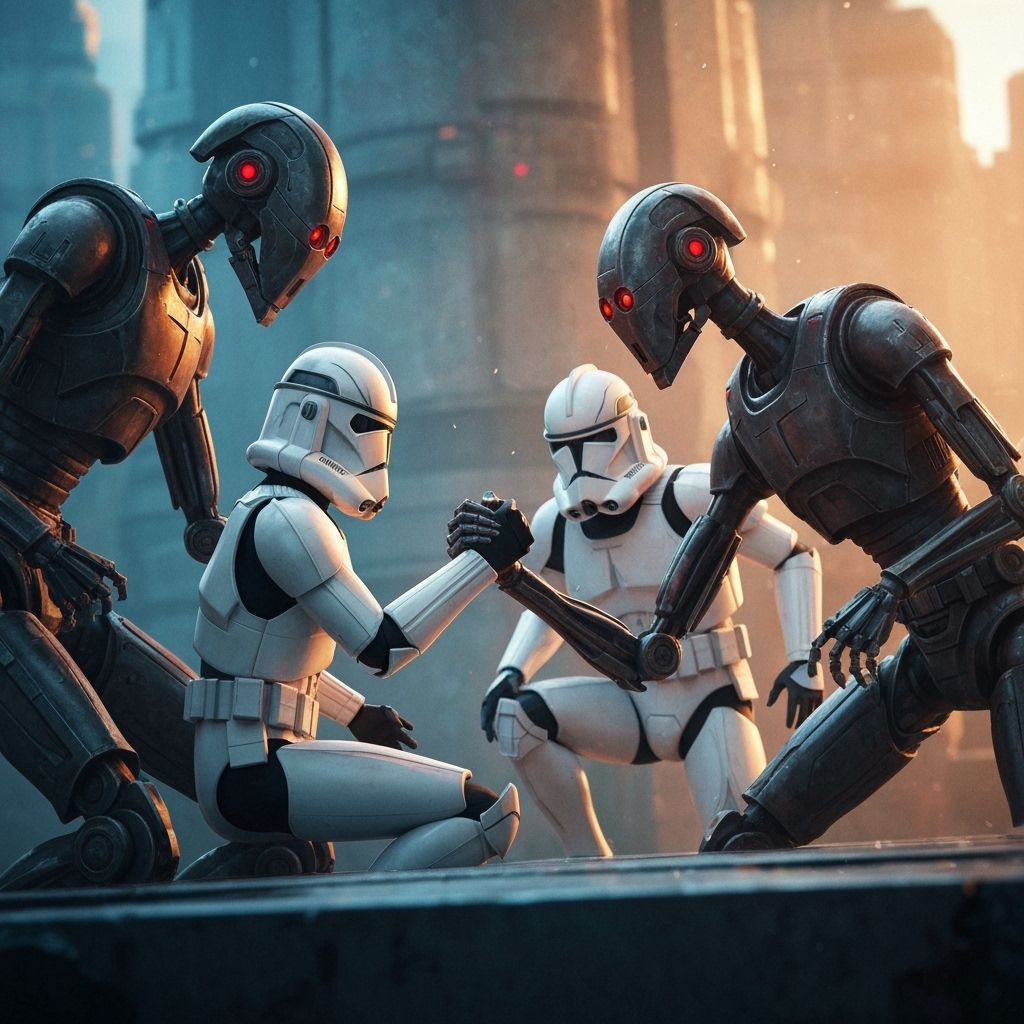 This image shows clone troopers arm wrestling battle droids in a gritty sci-fi scene. The image features a futuristic aesthetic, inspired by concept art and science fiction illustrators.