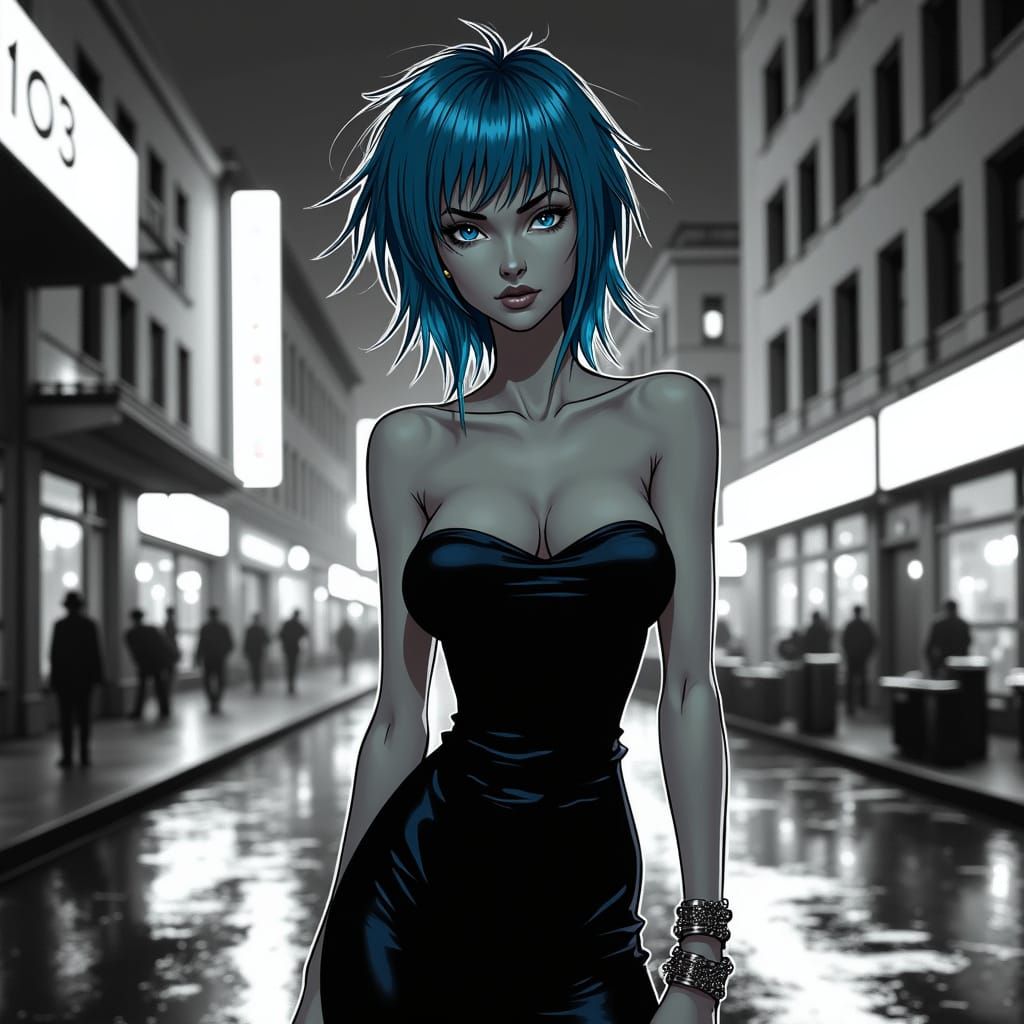 A comic-style image of a woman with bright blue spiky hair in a dark urban setting. The scene features a wet city street at night with neon lights, reminiscent of Frank Miller's Sin City aesthetic.