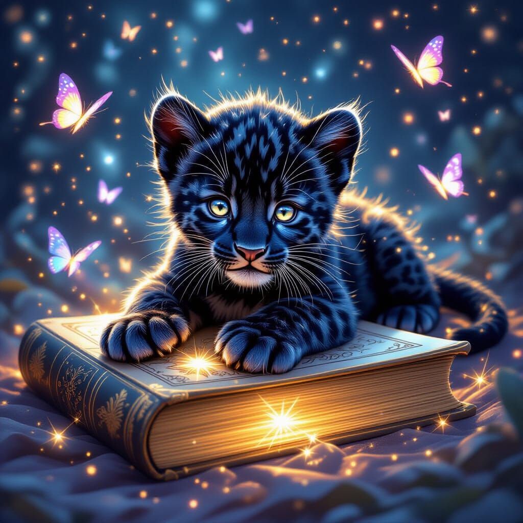 A captivating image of a baby black panther cub resting on a luminous, ancient book. Shimmering stardust butterflies flutter around it in a radiant, magical style reminiscent of digital fantasy art.