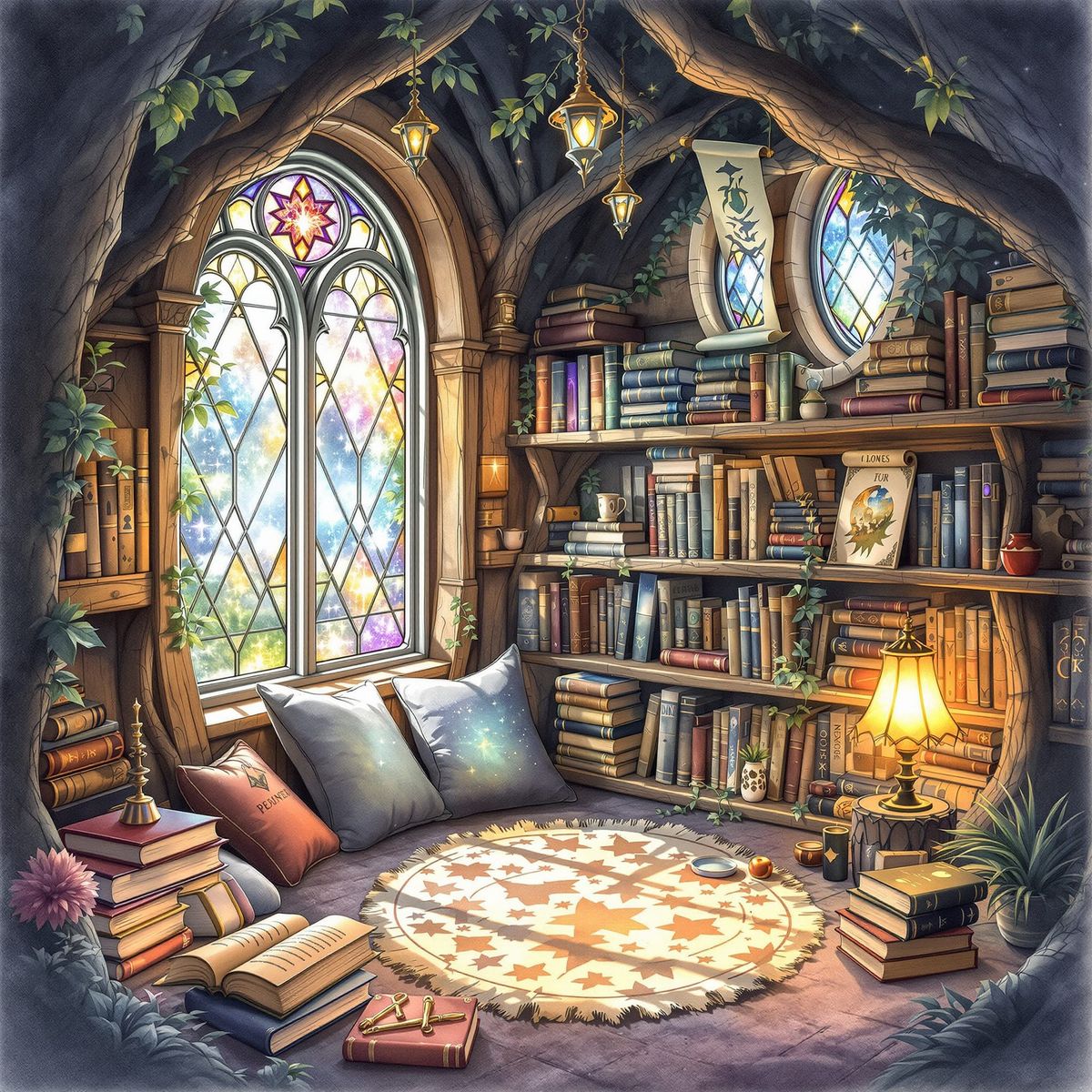 This image showcases a peaceful, cozy reading nook inside a magical treehouse filled with books and scrolls. Gentle watercolor art highlights intricate details and a warm, inviting atmosphere.