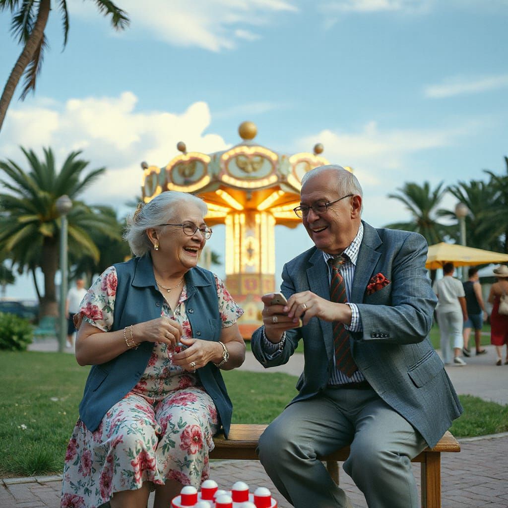 This image shows an elderly couple in a vibrant beachside park, enjoying carnival games. The scene is maximalist and rendered with hyper-realistic detail, creating a whimsical and cinematic fantasy atmosphere.