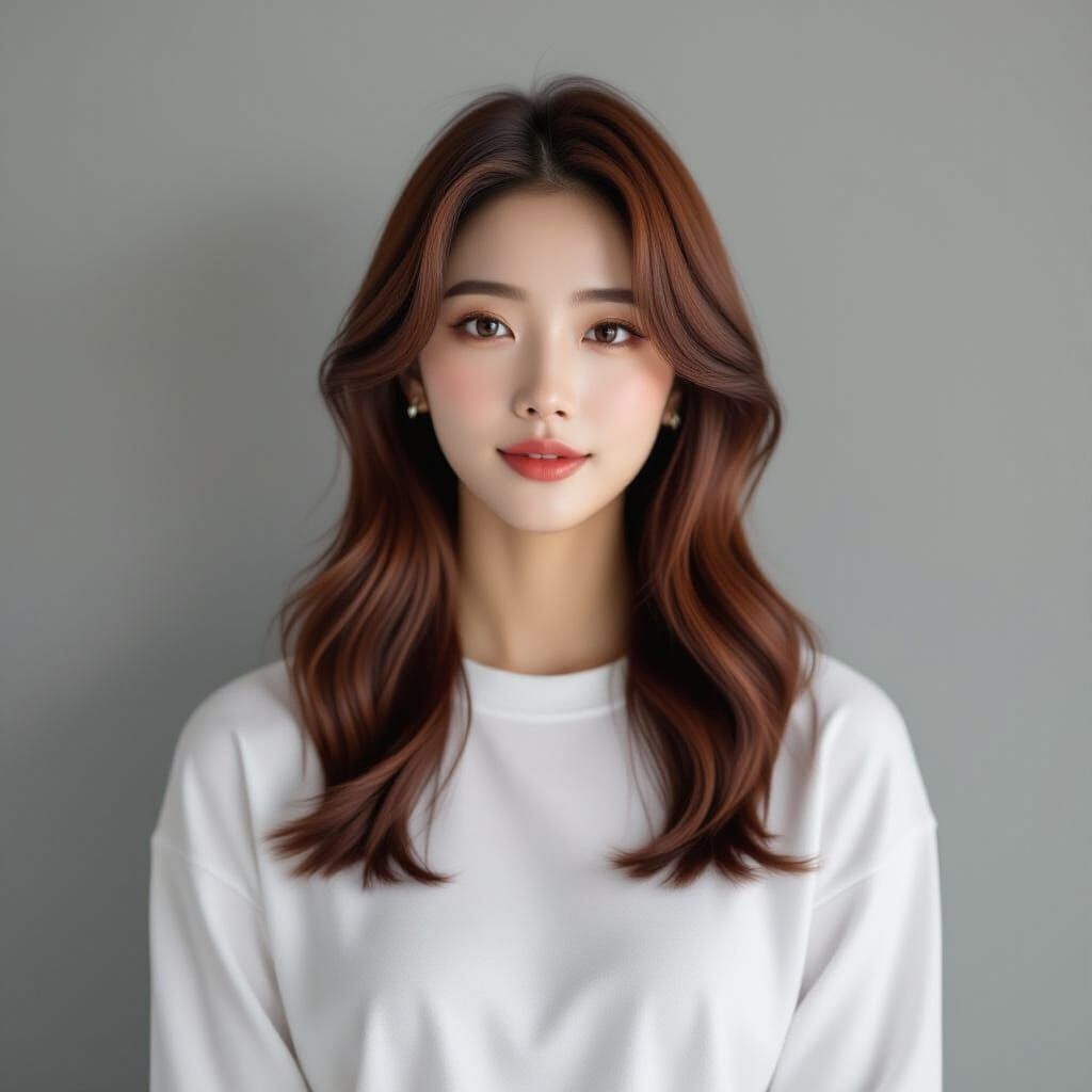 This image shows a portrait of a 20-year-old woman with a modern Korean style. The subject has straight bangs and medium reddish-brown hair, wearing a white long-sleeve shirt, rendered in 8k.