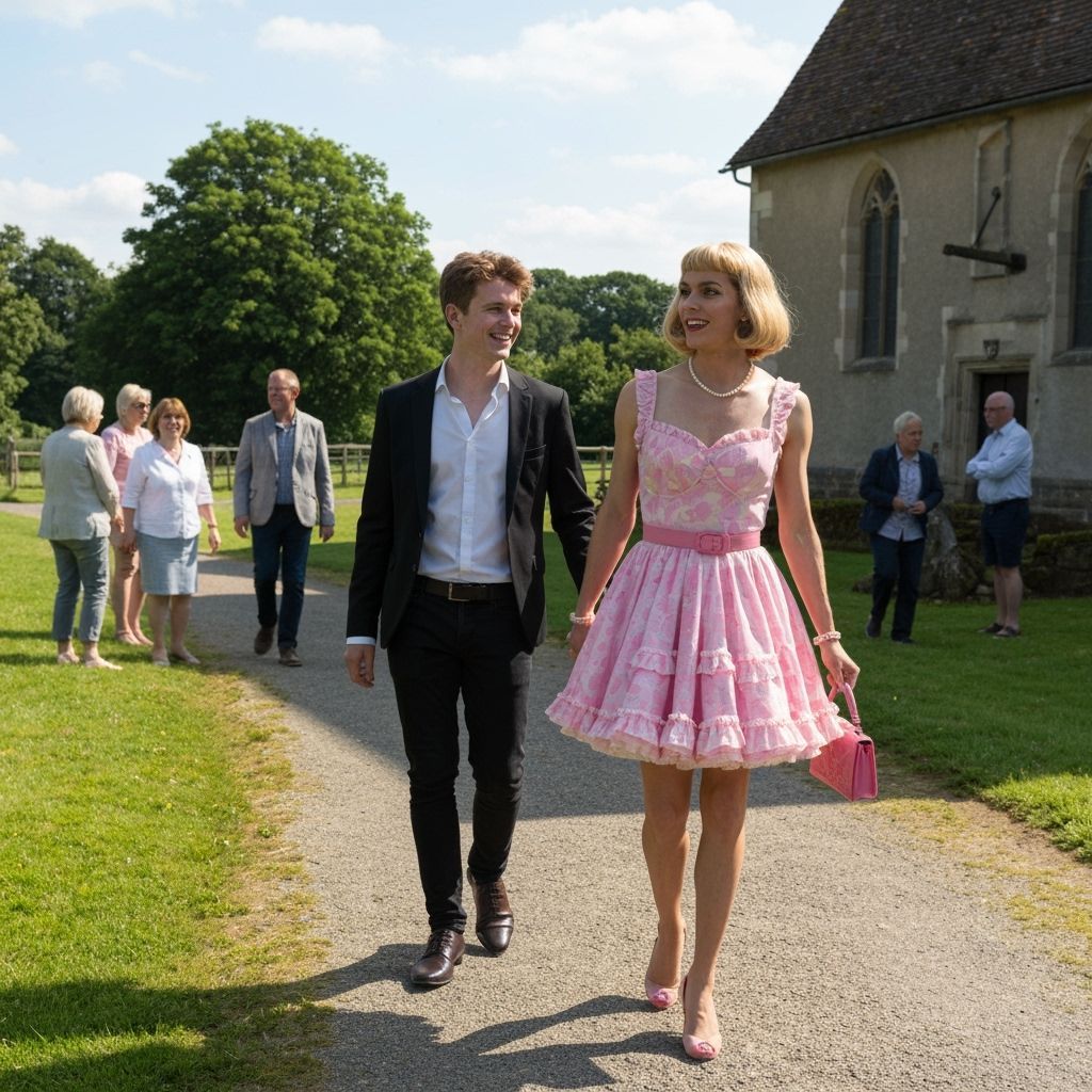 This image depicts a shy young man with blonde hair in a frilly 1950s minidress, carrying a pink purse and heels. He walks towards a countryside church on a sunny day.