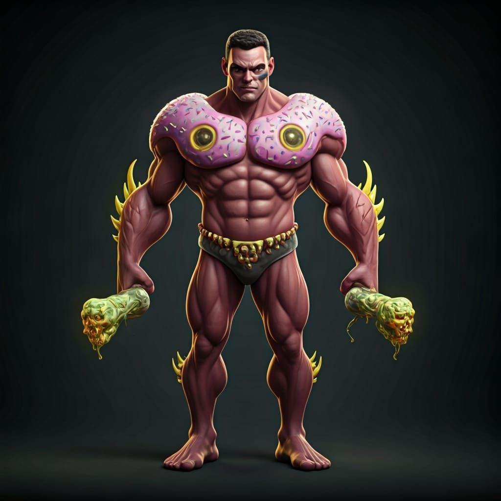 A digital painting of a donut-themed supervillain shooting poison glaze. The image showcases a vibrant and menacing character design with a playful yet dangerous aesthetic.