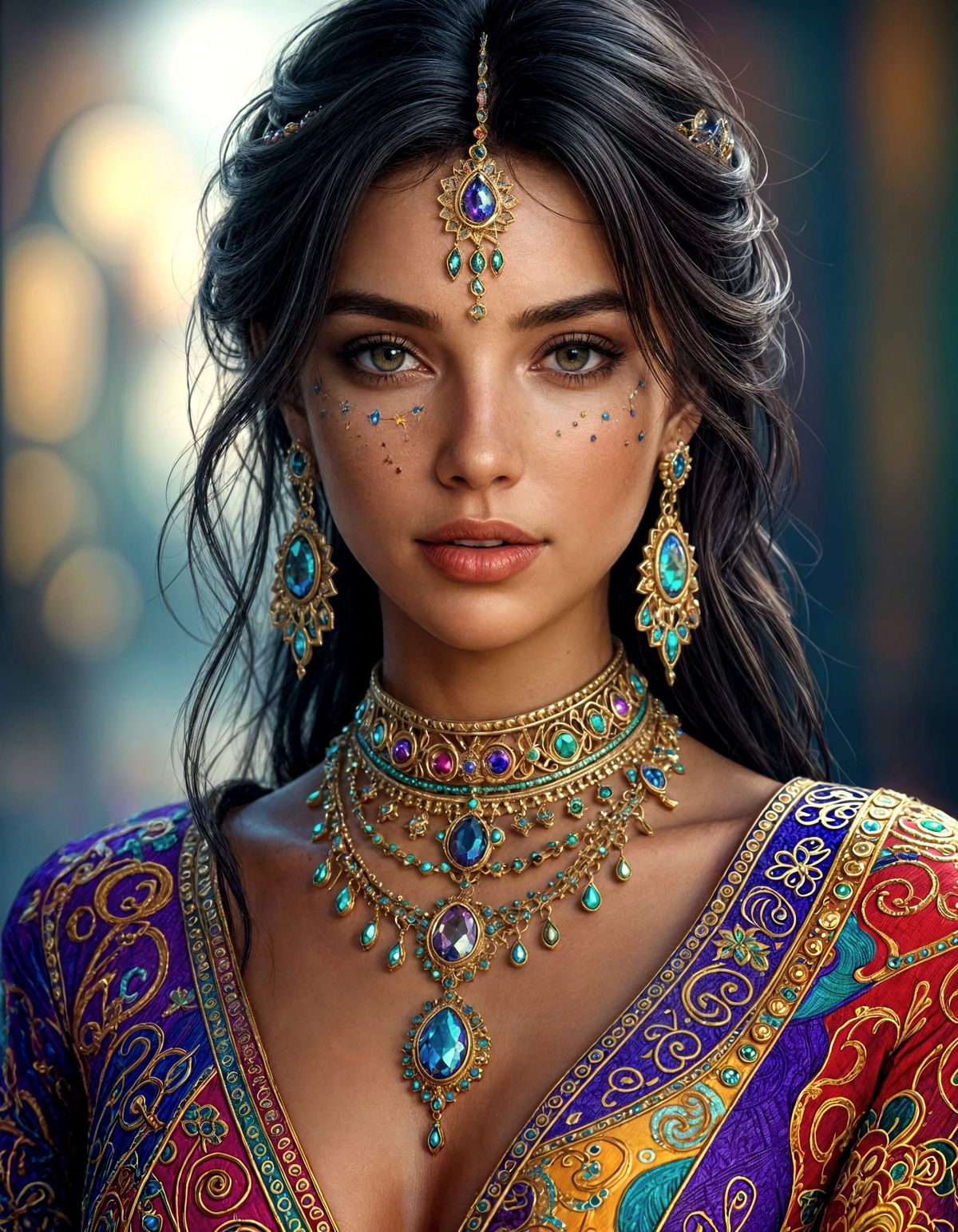 This image showcases a hyperrealistic portrait of a beautiful woman adorned with intricate, colorful clothing and advanced jewelry. Rendered with deep colors and fantastical detail, it evokes fantasy concept art.