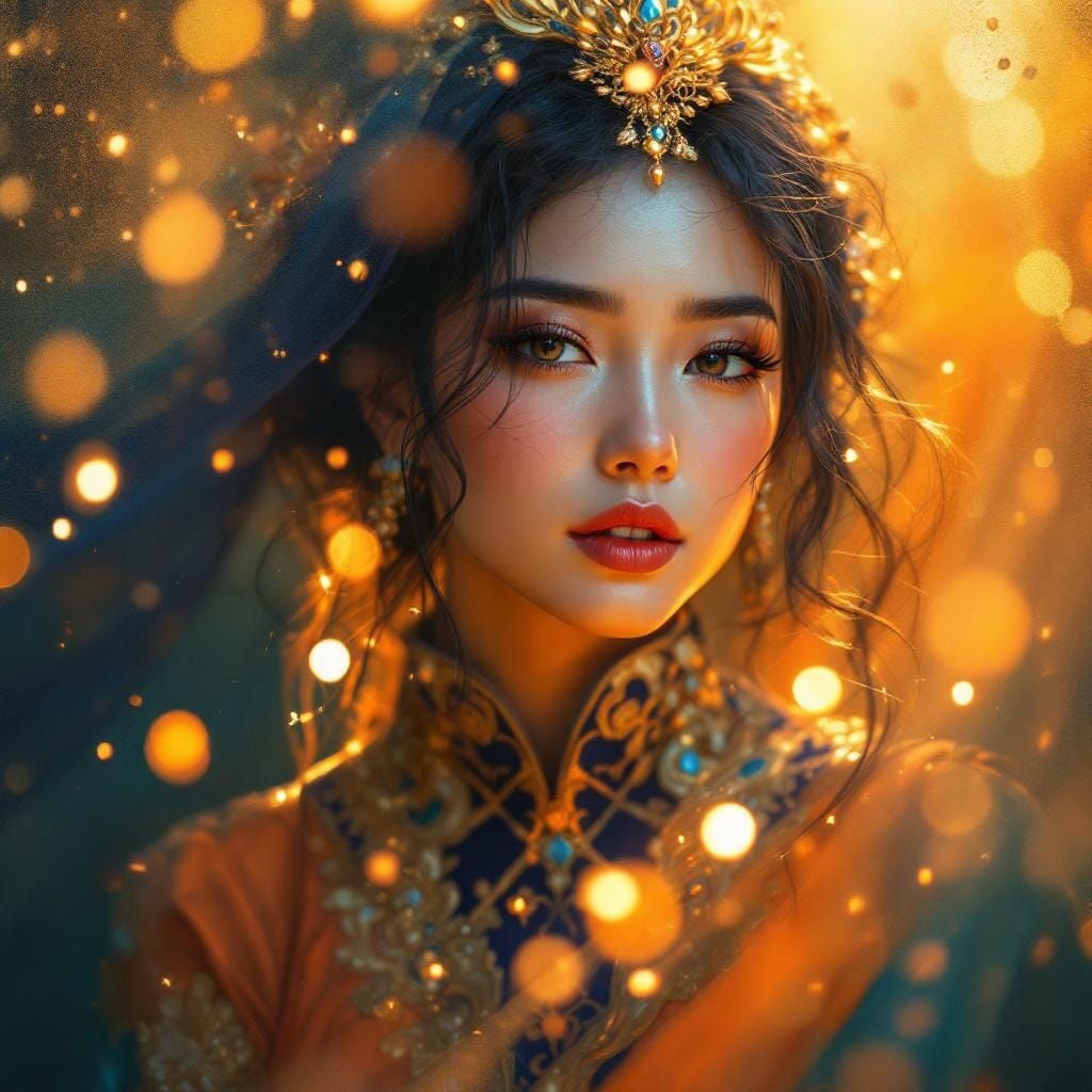 Oil painting. Medium shot. A woman wearing intricate clothing. Medium shot. Hyper-realistic oil painting style. Soft brushstrokes. Vibrant colors shimmering. Warm golden light with bokeh effects. Complementary colors, deep blues and oranges. Best quality, trending, 8k resolution, Unreal Engine 5, highly ...