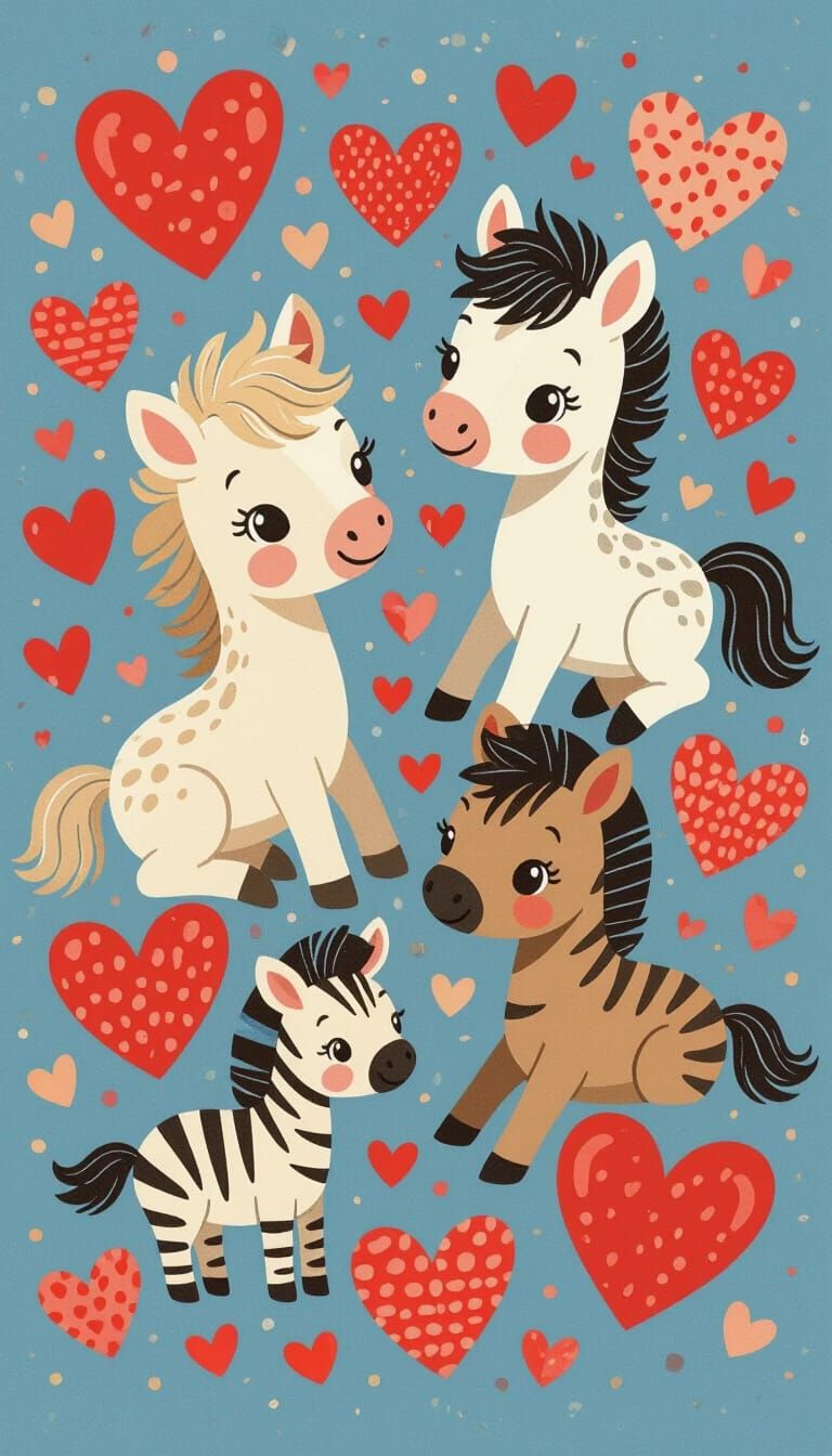 This image shows adorable baby foals and zebras surrounded by red hearts on a soft blue background, created in a whimsical, rounded illustration style.