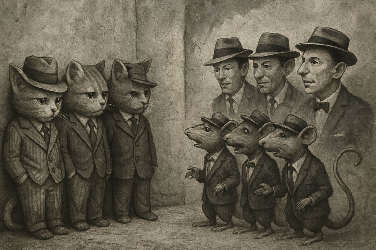 This image shows four kittens dressed as 1920s gangsters facing off against four rats resembling the Rat Pack. The artwork features abstract surrealism and concrete art elements.