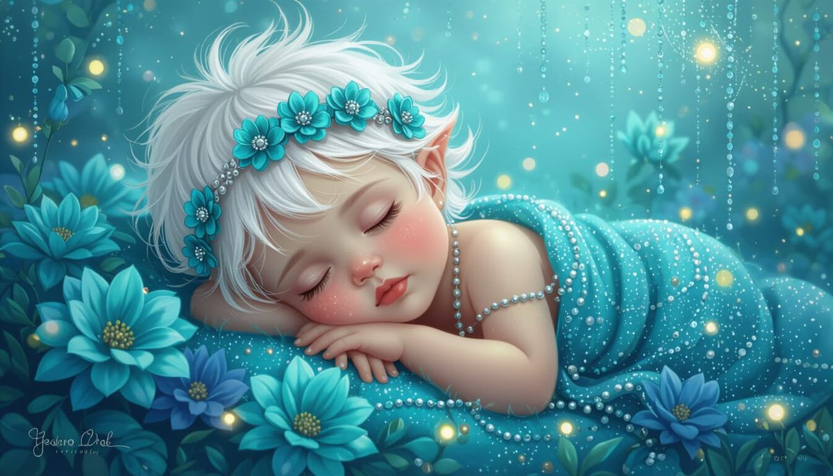 This image features an adorable baby sleeping peacefully amidst a vibrant bed of teal and blue flowers, adorned with a floral headband. Twinkling lights and glitter add a magical touch to the misty, detailed background.
