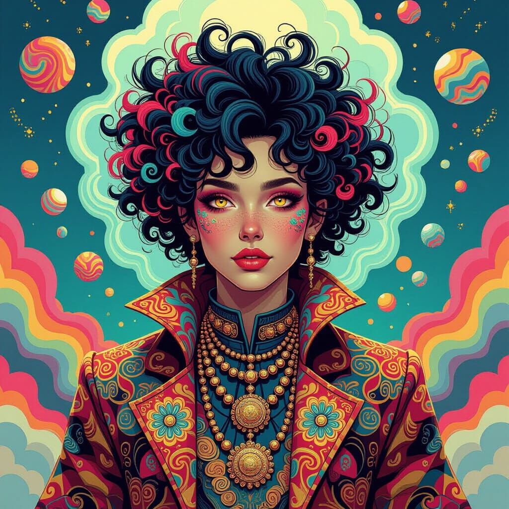 A striking picture of a character with colorful hair and glowing eyes amidst swirling psychedelic patterns. The subject is rendered in a surreal and dreamlike digital art style.