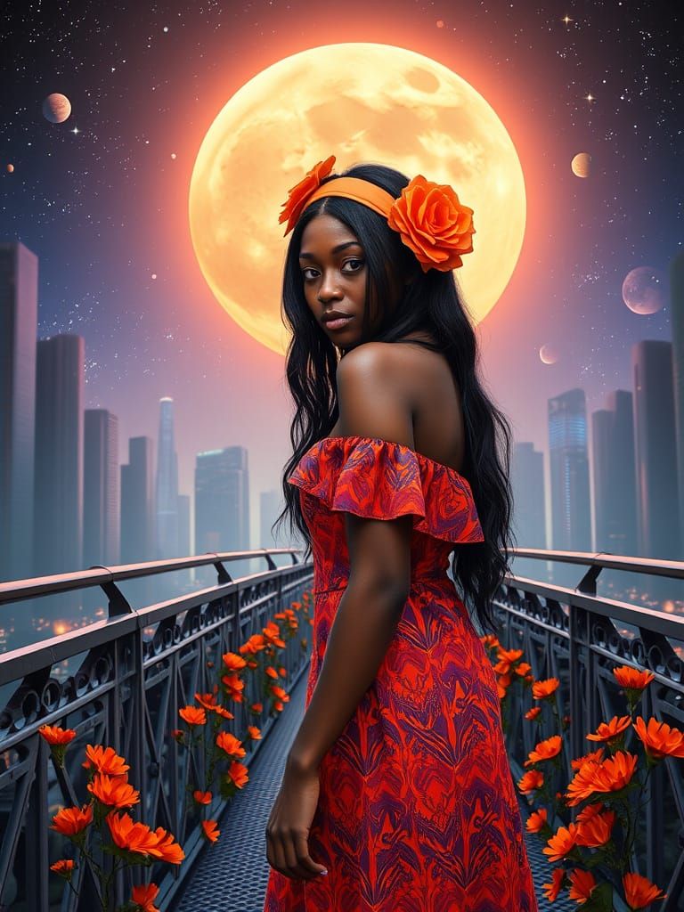 This hyperrealistic image showcases a Black woman with purple hair and an orange headband, wearing a patterned dress. She's on a bridge with flowers, under a glowing moon and starry sky, with a cityscape background. Cinematic lighting.