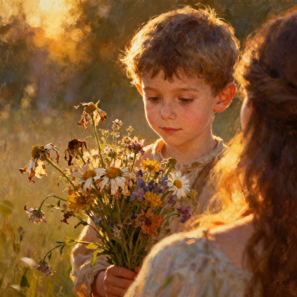A tender image of a young boy holding a slightly damaged bouquet of wildflowers, captured from a low perspective. Warm, soft sunlight creates a nostalgic, painterly glow, evoking luminous storybook illustrations.