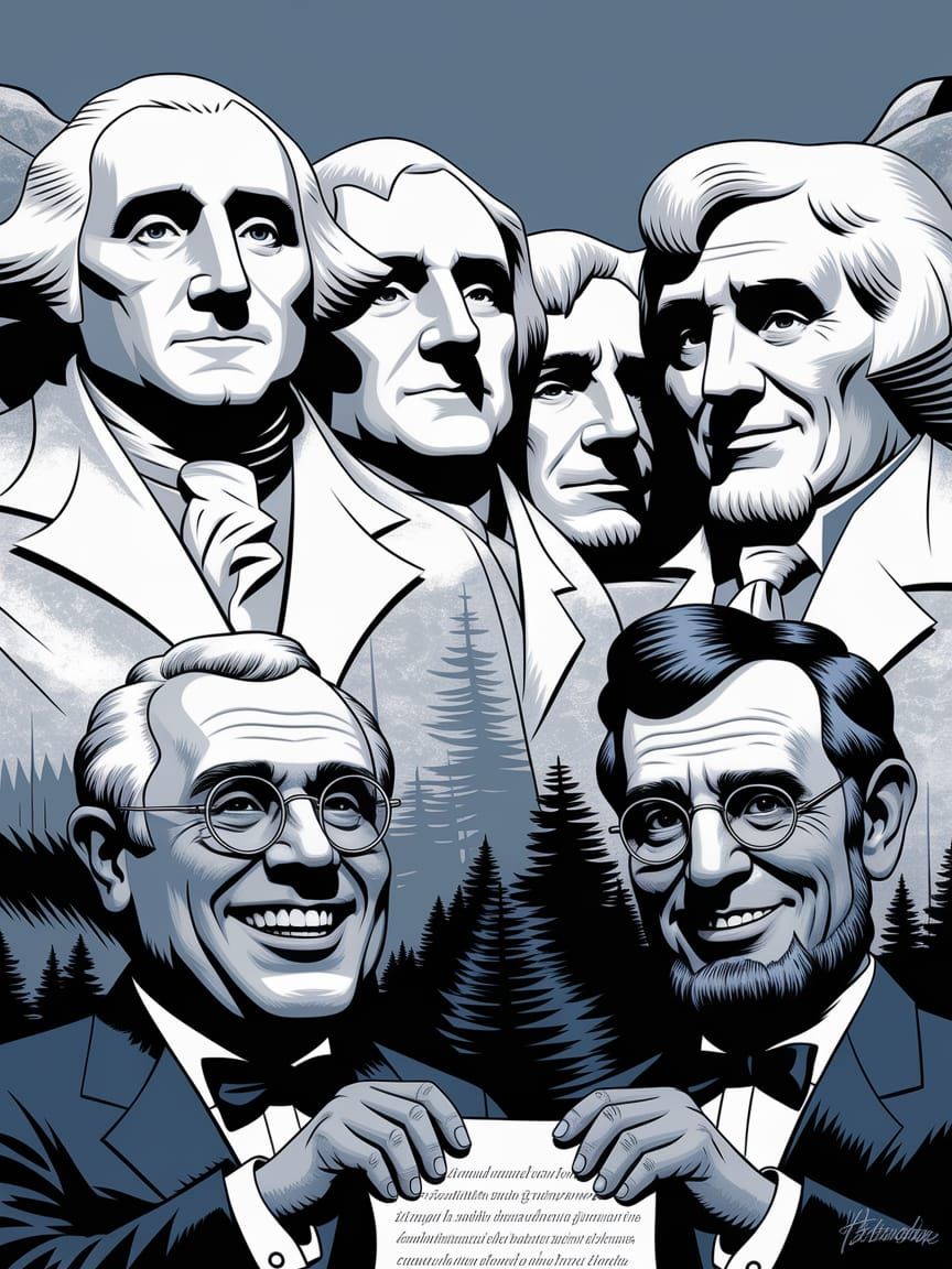 This image presents a lively caricature group portrait of the Mount Rushmore presidents, reimagined with exaggerated features and flowing ink lines. The artwork captures their iconic characteristics in a dynamic, expressive style, set against a subtle watercolor sunset.