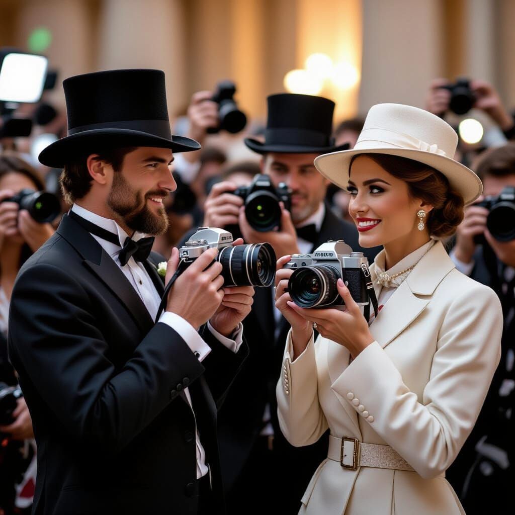 A vibrant image capturing photographers at a press conference. The subjects, formally dressed, are holding both vintage and modern cameras. The scene is lit dramatically, with a photorealistic yet documentary feel.