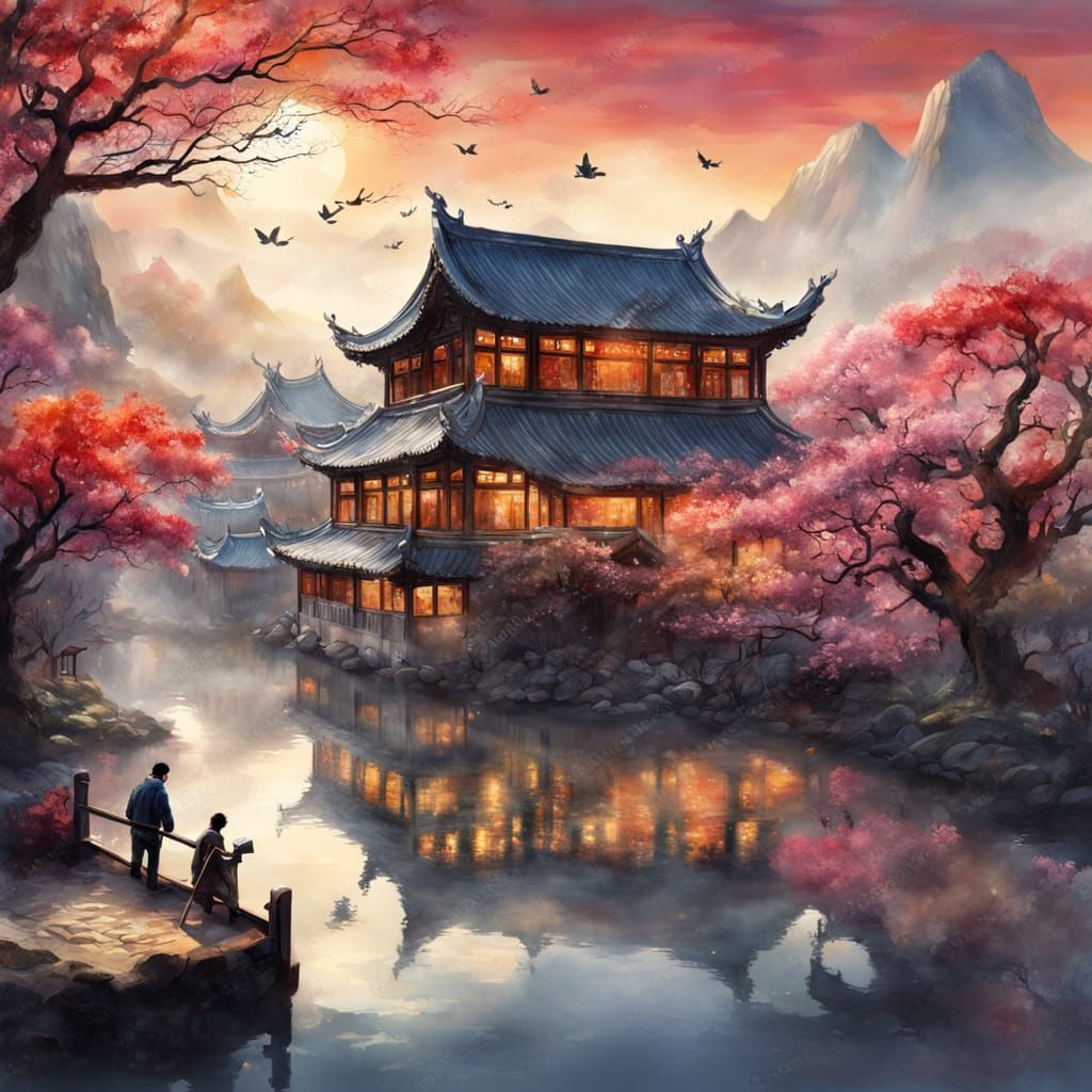 A dramatic and atmospheric digital matte painting capturing the vibrant colors and intricate details of a Chinese Spring Festival landscape.