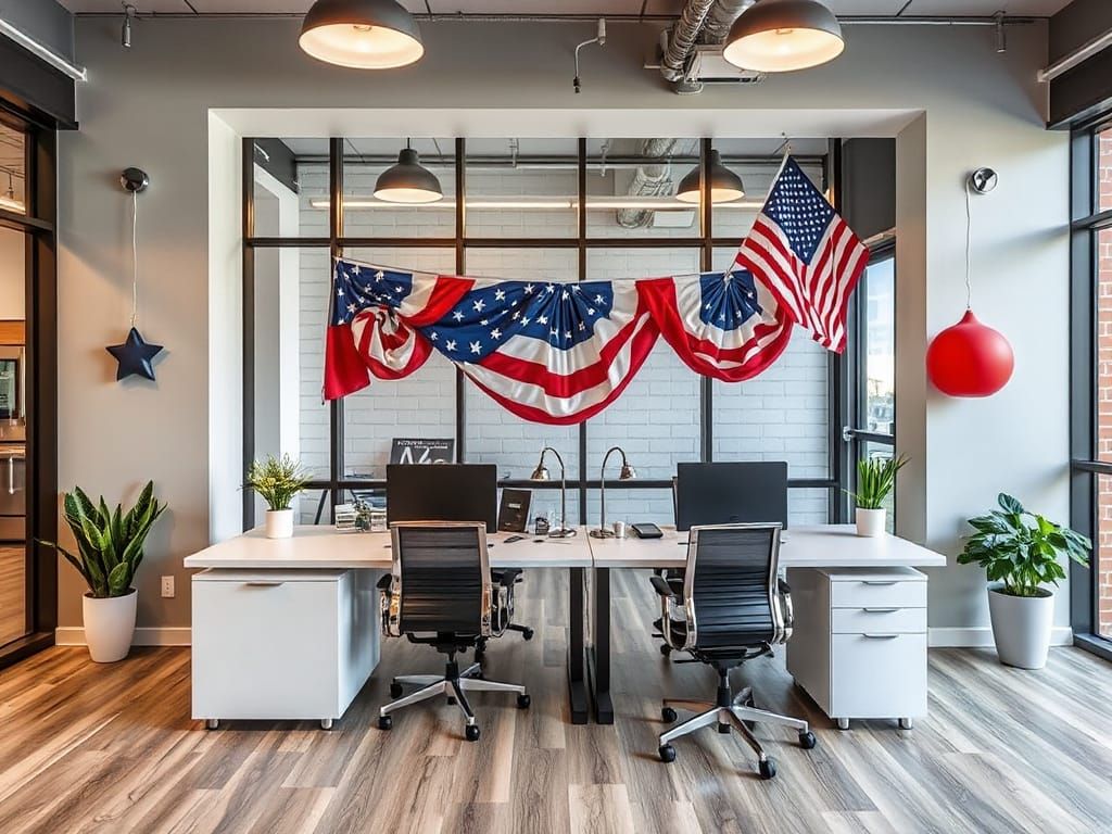 This image shows a contemporary office space decorated for Memorial Day. The patriotic decorations add a festive touch to the modern interior, creating a unique atmosphere.