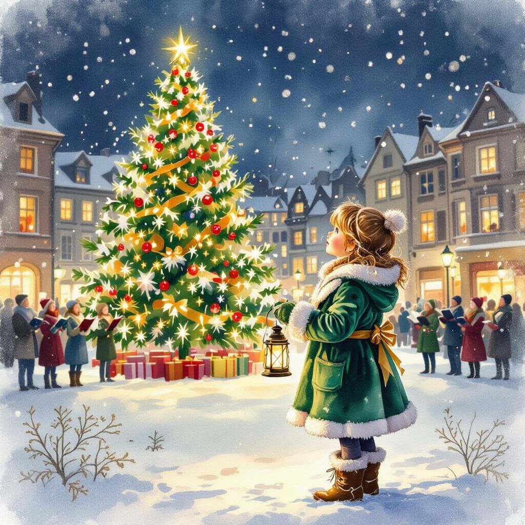 A detailed mixed media image of a girl in a green coat looking at a Christmas tree. Snow falls gently as carolers sing, creating a warm, festive scene.