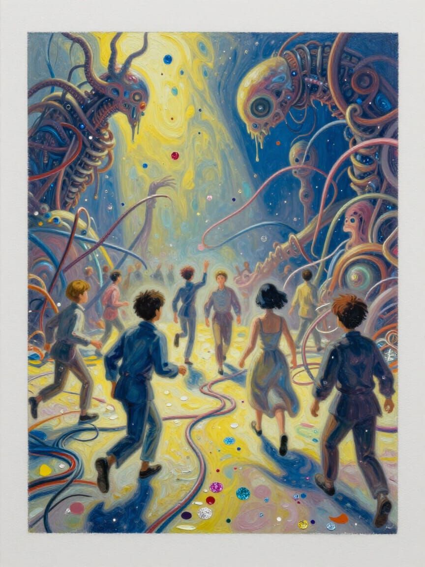 This image depicts a frenzied scene with cables, running figures, and scattered debris, rendered with thick, oozing gouache for a 3D effect. It features a blend of surreal, biomechanical, whimsical, and dark fantasy elements with iridescent colors and impasto texture.