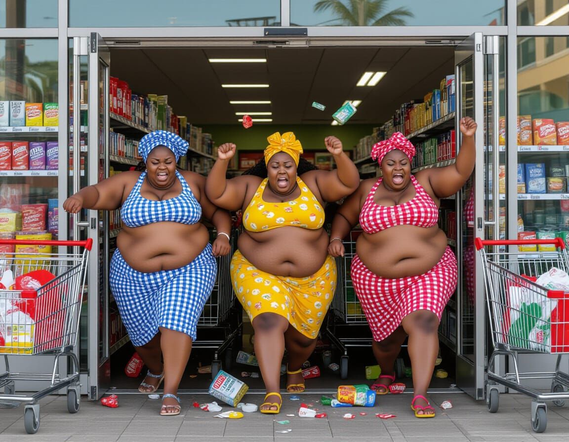 A hyper-detailed, photorealistic image capturing a chaotic scene of items spilling from overturned shopping carts as three women exit a supermarket. Vivid colors and sharp detail emphasize the disarray.