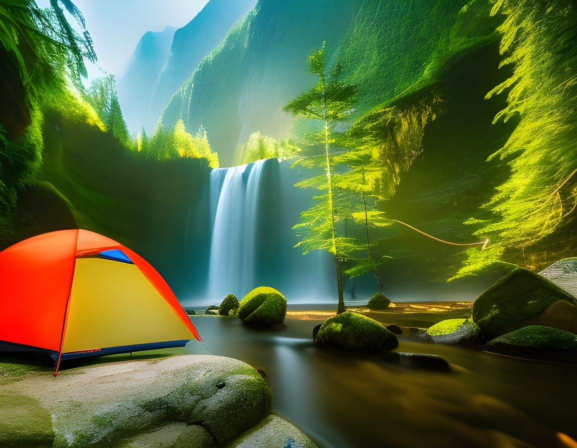 A picturesque campsite scene featuring a woman's tent near a waterfall. The image captures a serene morning with a breakfast table, camping gear, and the warm glow of sunrise. Created as cosmic fantasy art.
